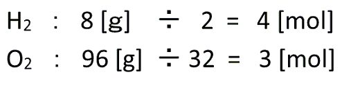 水素と酸素の分子量はそれぞれ2、32ですので、まずは質量[g]を[mol]に直すと、