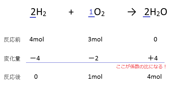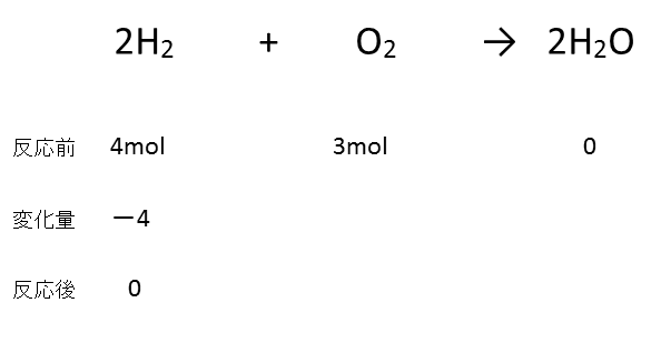 今、水素は4mol、酸素は3molありますが、もし酸素が全部反応しようとすると水素は6mol必要になるので、酸素を使い切ることはできません。