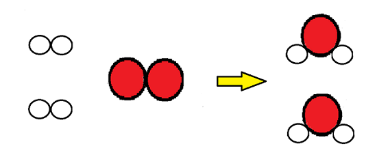 水素分子2個と酸素分子1個から、水分子が2個生成する式。