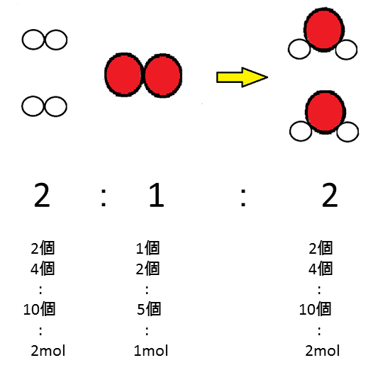 molは数の単位ですから、水素分子2molと酸素分子1molから、水分子2molができます。