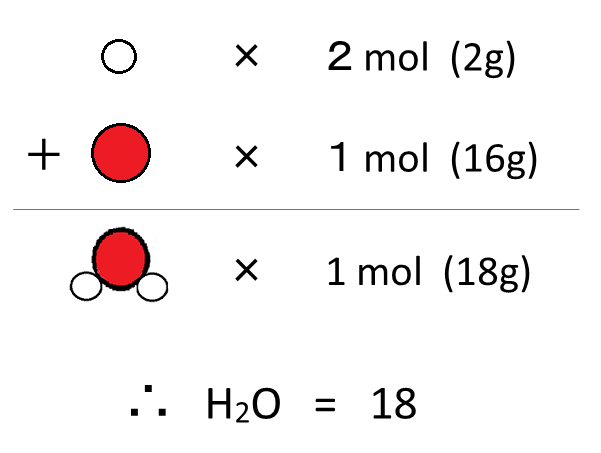 例えば水分子であれば、水素原子2つと酸素原子1つで出来ているので、質量は合計すれば求められます。