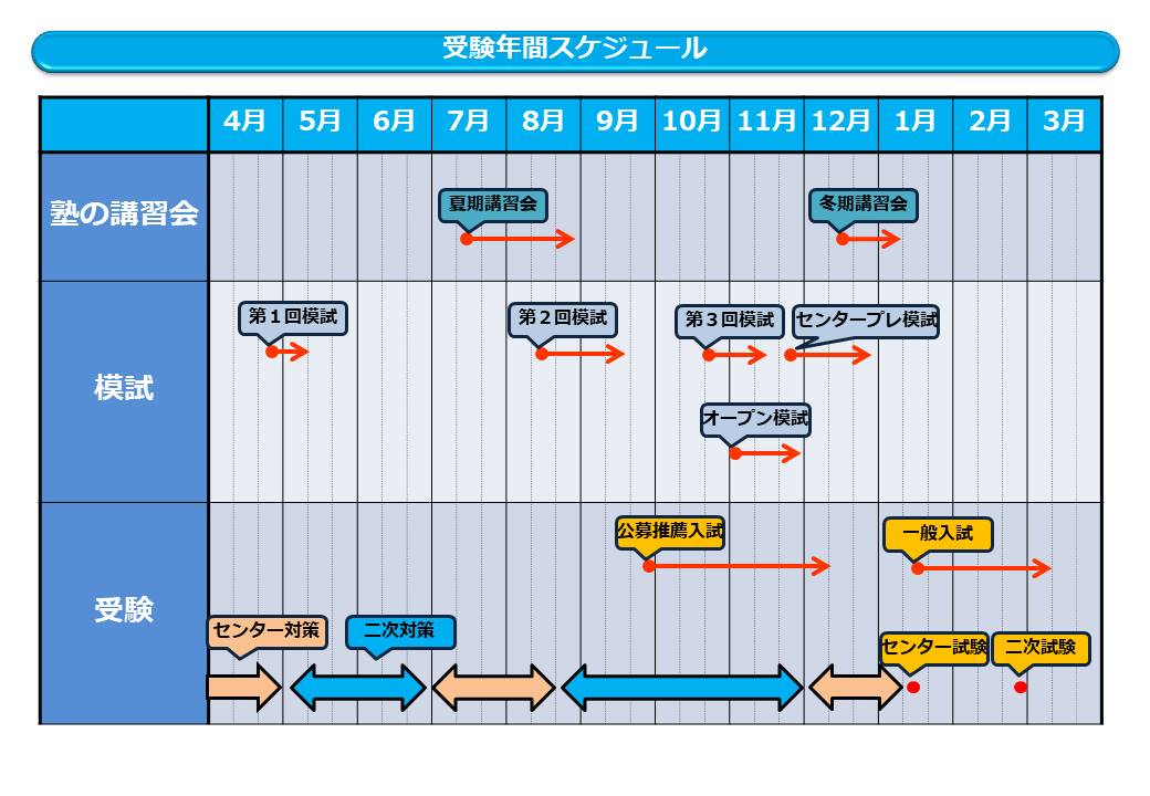 11月のオープン模試(記述模試)が一つの区切りとなっていて、ここで良い成績を叩き出すことを目標に受験勉強を計画して下さい。