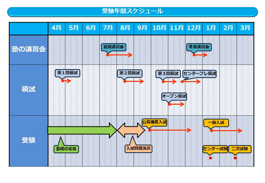 先ほど述べた通り、一般入試よりも早い時期にあるため、勉強スケジュールも3ヶ月程前倒しで進めると合格率が上がります。